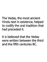 The Vedas, the most ancient Hindu text in existence, helped to codify the oral tradition that had preceded it. It is believed that the Vedas were written between the third and the fifth centuries BC.