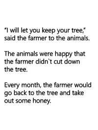 “I will let you keep your tree,” said the farmer to the animals. The animals were happy that the farmer didn`t cut down the tree. Every month, the farmer would go back to the tree and take out some honey.
