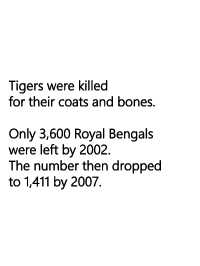 Tigers were killed for their coats and bones. Only 3,600 Royal Bengals were left by 2002. The number then dropped to 1,411 by 2007.