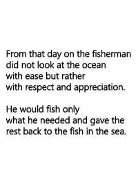 From that day on the fisherman did not look at the ocean with ease but rather with respect and appreciation. He would fish only what he needed and gave the rest back to the fish in the sea.