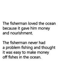 The fisherman loved the ocean because it gave him money and nourishment. The fisherman never had a problem fishing and thought it was easy to make money off fishes in the ocean.