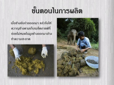 ขั้นตอนในกำรผลิต เมื่อช้ำงขับถ่ำยออกมำ แล้วจึงให้ ควำญช้ำงตำมเก็บเมล็ดกำแฟที่ ย่อยไม่หมดในมูลช้ำงออกมำล้ำง ท ำควำมสะอำด
