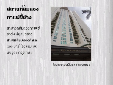 สถานที่ลิ้มลอง กาแฟขี้ช้าง สำมำรถลิ้มลองกำแฟขี้ ช้ำงได้ที่มูลนิธิช้ำง สำมเหลี่ยมทองค ำและ เดอะบำร์ โรงแรมเพน นินซูลำ กรุงเทพฯ โรงแรมเพนนินซูลำ กรุงเทพฯ