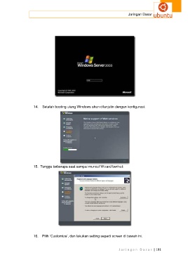 Jaringan Dasar 14. Setelah booting ulang Windows akan dilanjutin dengan konfigurasi. 15. Tunggu beberapa saat sampai muncul Wizard berikut: 16. Pilih ‘Customize’, dan lakukan setting seperti screen di bawah ini. J a r i n g a n D a s a r | 191