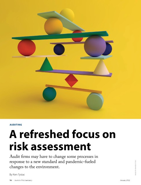 AUDITING A refreshed focus on risk assessment Audit firms may have to change some processes in response to a new standard and pandemic-fueled changes to the environment. IMAGE BY ADAASK/ISTOCK By Ken Tysiac 16 | Journal of Accountancy January 2022