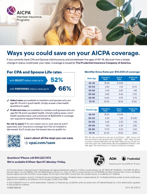 Insurance Agency; and in NY, AIS Affinity Insurance Agency. The Plan Agent of the AICPA Insurance Trust, Aon Insurance Services, is not affiliated with Prudential.