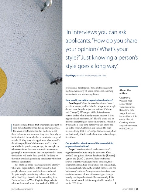 look for cultural fit when hiring new employees. air in the room. Culture is like the air: It’s that 919-402-4125.