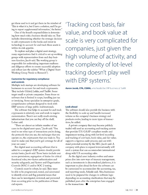 businesses to account for and track cryptoassets. Aaron Jacob, CPA, CGMA, who heads the ERP business at TaxBit