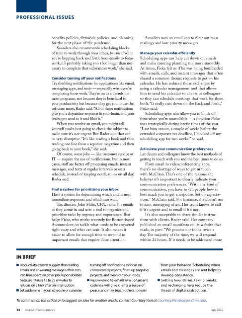 benefits policies, firmwide policies, and planning Saunders uses an email app to filter out mass