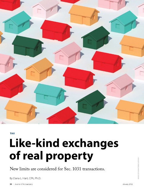 TAX Like-kind exchanges of real property IMAGES BY EUGENESERGEEV/ISTOCK New limits are considered for Sec. 1031 transactions. By Dana L. Hart, CPA, Ph.D. 30 | Journal of Accountancy January 2022