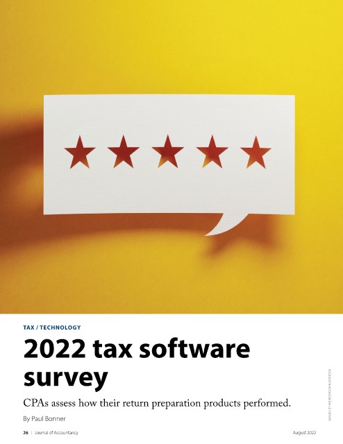 TAX / TECHNOLOGY 2022 tax software survey CPAs assess how their return preparation products performed. IMAGES BY MICROSTOCKHUB/ISTOCK By Paul Bonner 26 | Journal of Accountancy August 2022