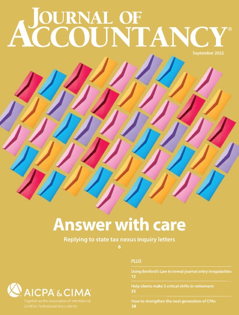 September 2022 Answer with care Replying to state tax nexus inquiry letters 6 PLUS Using Benford’s Law to reveal journal entry irregularities 12 Help clients make 3 critical shifts in retirement 22 How to strengthen the next generation of CPAs 28