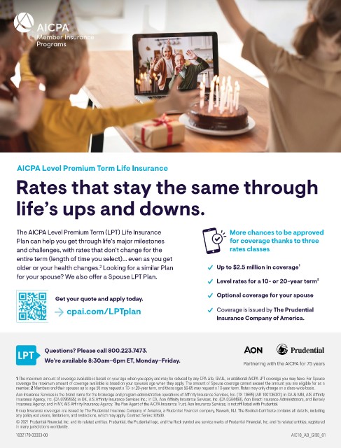 Insurance Agency; and in NY, AIS Affinity Insurance Agency. The Plan Agent of the AICPA Insurance Trust, Aon Insurance Services, is not affiliated with Prudential.