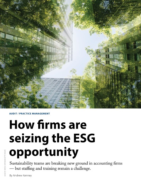 AUDIT / PRACTICE MANAGEMENT How firms are seizing the ESG IMAGE BY HIROSHI WATANABE/GETTY IMAGES opportunity Sustainability teams are breaking new ground in accounting firms — but staffing and training remain a challenge. By Andrew Kenney