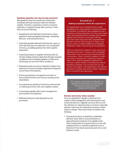 • Reflecting tolerance in operating policies and Once an organization’s appetite is developed and