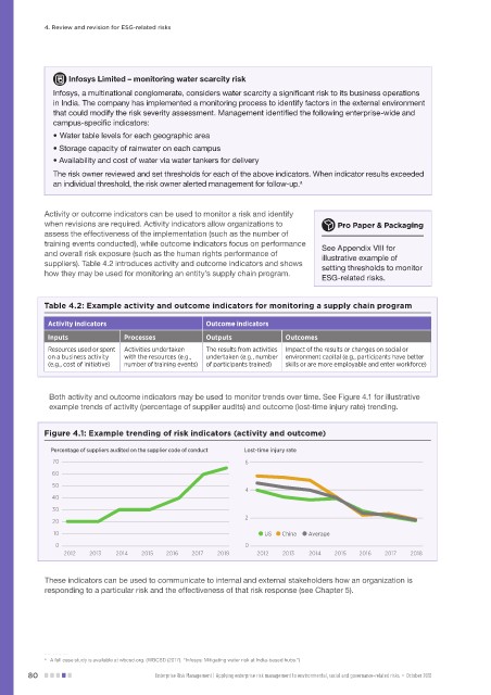 suppliers). Table 4.2 introduces activity and outcome indicators and shows setting thresholds to monitor