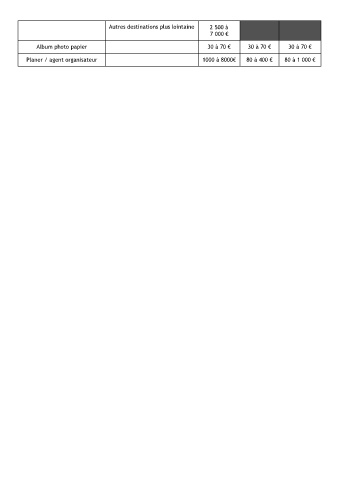 Autres destinations plus lointaine 2 500 à 7 000 € Album photo papier 30 à 70 € 30 à 70 € 30 à 70 € Planer / agent organisateur 1000 à 8000€ 80 à 400 € 80 à 1 000 €