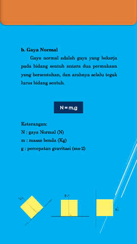 b. Gaya Normal Gaya normal adalah gaya yang bekerja pada bidang sentuh antara dua permukaan yang bersentuhan, dan arahnya selalu tegak lurus bidang sentuh. N = m.g Keterangan: N : gaya Normal (N) m : massa benda (Kg) g : percepatan gravitasi (ms-2)