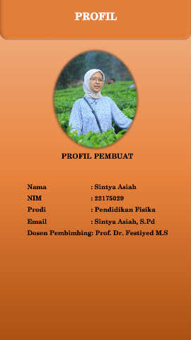 PROFIL PROFIL PEMBUAT Nama : Sintya Asiah NIM : 22175029 Prodi : Pendidikan Fisika Email : Sintya Asiah, S.Pd Dosen Pembimbing: Prof. Dr. Festiyed M.S