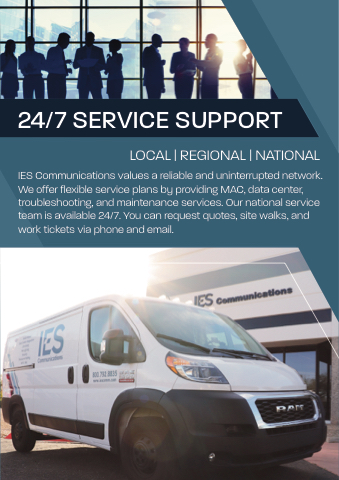 IES Communications values a reliable and uninterrupted network. We offer exible service plans by providing MAC, data center, troubleshooting, and maintenance services. Our national service team is available 24/7. You can request quotes, site walks, and work tickets via phone and email.