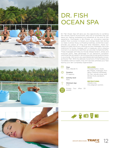 •Transportation, towel, Bio-Pilates, massages, foot detox, floating mattresses, Dr. Fish, natural juices, soft drinks, fruits, sandwich, salads.