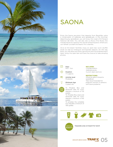Enjoy the Saona excursion that departs from Bayahibe using a combination of sailboats and speedboats. In the morning, departing by speedboat, you will enjoy the coast of El Parque National del Este. You will also see La Roca (The Rock); the mangroves plus a stop by the natural swimming pool, where you can refresh yourself and search for a starfish.