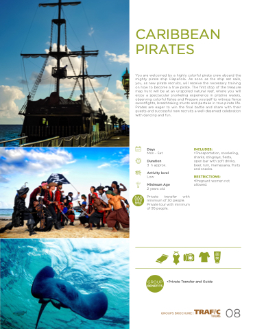 You are welcomed by a highly colorful pirate crew aboard the mighty pirate ship Hispañola. As soon as the ship set sails, you, as new pirate recruits, will receive the necessary training on how to become a true pirate. The first stop of the treasure map hunt will be at an unspoiled natural reef, where you will enjoy a spectacular snorkeling experience in pristine waters, observing colorful fishes and Prepare yourself to witness fierce swordfights, breathtaking stunts and partake in true pirate life. Pirates are eager to win the final battle and share with their guests and successful new recruits a well-deserved celebration with dancing and fun.
