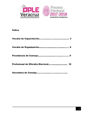Índice Vocalía de Capacitación……………………………………… 3 Vocalía de Organización……………………………………… 6 Presidencia de Consejo………………………………………. 9 Profesional de Oficialía Electoral………………………. 12 Secretaría de Consejo………………………………………. 1