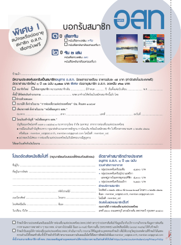 ข้าพเจ้า ............................................................................................................................ มีความประสงค์บอกรับเป็นสมาชิกอนุสาร อ.ส.ท. นิตยสารรายเดือน ราคาฉบับละ ๘๕ บาท (ค่าจัดส่งในประเทศฟรี)