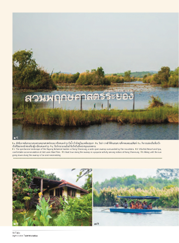 1. The spectacular landscape of the Rayong Botanical Garden or Nong Chamrung, a wide open swamp surrounded by the mountains. 2. Villa Bali Resort and Spa, comfortable accommodation at Hat Laem Mae Phim. 3. Boat tour along the swamp is a popular activity among visitors at Nong Chamrung. 4. Biking until the sun going down along the swamp is fun and mesmerizing.