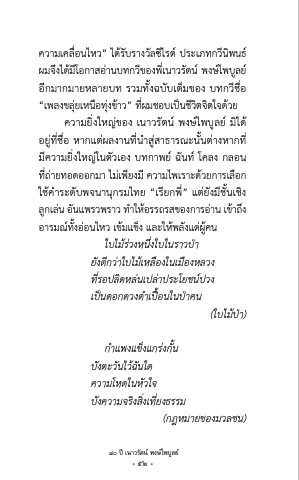 ความื่ยัิงใหญข้อง เนาวรีัตน์ พงษ์์ไพบูลัยั์ มื่ิได้ อยัูที่่ช้่อ หากแตผลังานที่่นําาสืูสืาธารีณะนันตางหากที่่ มื่่ความื่ยัิงใหญในตัวเอง บที่กาพยั์ ฉันที่์ โคลัง กลัอน ที่่ถายัที่อดออกมื่า ไมื่เพ่ยังมื่่ ความื่ไพเรีาะด้วยัการีเลั่อก ใช้้คําารีะดับพจนาน่กรีมื่ไที่ยั “เรี่ยักพ่” แตยัังมื่่ช้ันเช้ิง ลักู เลัน อนั แพรีวพรีาว ที่าํา ใหอ้ รีรีถรีสืข้องการีอา น เข้า้ ถง่ อารีมื่ณ์ที่ังออนไหว เข้้มื่แข้็ง แลัะให้พลัังแดผู้คน