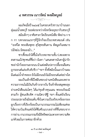 ผมื่เป็็นเด็กที่่มื่่ไฟฝันช้อบอานหนังสื่อแลัะเพรีาะ ความื่ยัากจนไมื่มื่ เ่ งนิ กนิ ข้า้ วกลัางวนั จง่ เข้า้ หอ้ งสืมื่ด่ ตะลัยั่ อานหนังสื่อเลัมื่โตๆ ได้แกข้่นช้้างข้่นแผน พรีะอภู่ัยัมื่ณ่ สืามื่กก ผู้ช้นะสืิบที่ิศ กามื่นิตวาสืิฐ่ ฯลัฯ ตังแตยัังเรี่ยัน ป็รีะถมื่ป็ลัายัถง่ มื่ธั ยัมื่ตน้ ซึ่ง่ ในความื่เป็น็ จรีงิ บที่รีอ้ ยักรีอง ผูกเรี่องรีาวที่่เรี่ยังรี้อยัเป็็นงานวรีรีณกรีรีมื่ไมื่เพ่ยังแตจะ ให้ความื่บันเที่ิงแตยัังได้ซึ่่มื่ซึ่ับแบบอยัางที่่ช้่นช้อบจาก การีอา น งานวรีรีณกรีรีมื่จง่ มื่อ่ ที่ิ ธพิ ลับมื่ เพาะที่างความื่คดิ แกตัวผมื่ในกาลัตอมื่าอ่กด้วยั