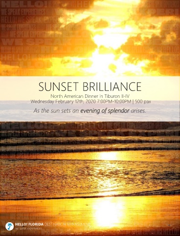SUNSET BRILLIANCE North American Dinner in Tiburon II-IV Wednesday February 12th, 2020 7:00PM-10:00PM | 500 pax As the sun sets an evening of splendor arises. HELLO! FLORIDA DESTINATION MANAGEMENT we speak experiences
