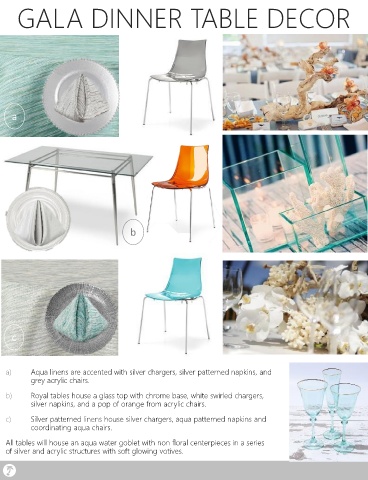 b) Royal tables house a glass top with chrome base, white swirled chargers,