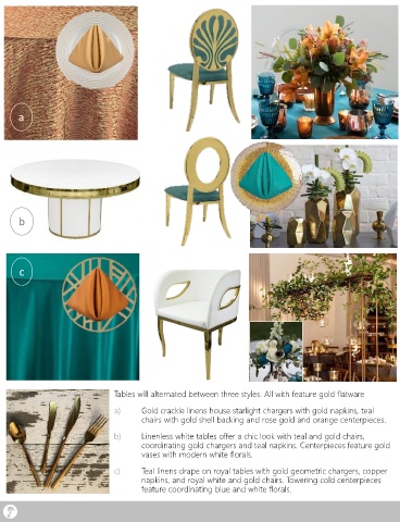c) Teal linens drape on royal tables with gold geometric chargers, copper
