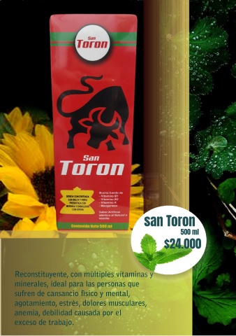 san Toron 500 ml $24.000 Reconstituyente, con mùltiples vitaminas y minerales, ideal para las personas que sufren de cansancio fìsico y mental, agotamiento, estrès, dolores musculares, anemia, debilidad causada por el exceso de trabajo.