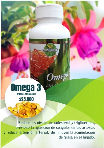 Omega 3 1200mg - 100 Capsulas $25.000 Reduce los niveles de colesterol y triglicéridos, previene la aparición de coágulos en las arterias y reduce la tensión arterial, disminuyen la acumulación de grasa en el hígado.