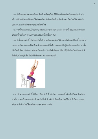 (20)   ท่ายกขาแตะบนเก้าอี้ ให้เริ่มจากยืนหน้าเก้าอี้ แล้วค่อย ๆ ยกขาขวาขึ้น โดยที่เข่าไม่งอ ส่วนปลาย