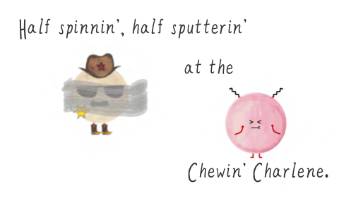 HALF SPINNIN', HALF SPUTTERIN' AT THE >< _; ---( \__ JL CHEWIN' CHARLENE.