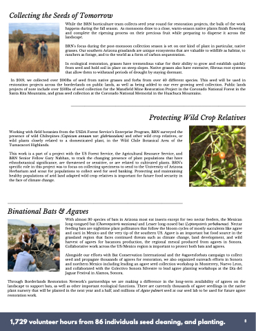 In 2019, we collected over 200lbs of seed from native grasses and forbs from over 40 different species. This seed will be used in restoration projects across the borderlands on public lands, as well as being added to our ever growing seed collection. Public lands projects of note include over 250lbs of seed collection for the Mansfield Mine Restoration Project in the Coronado National Forest in the Santa Rita Mountains, and grass seed collection at the Coronado National Memorial in the Huachuca Mountains.
