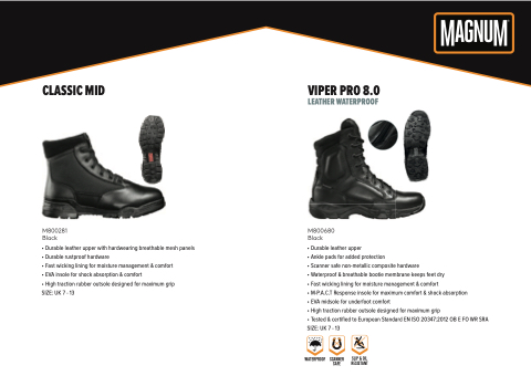 • Tested & certified to European Standard EN ISO 20347:2012 OB E FO WR SRA SIZE: UK 7 - 13