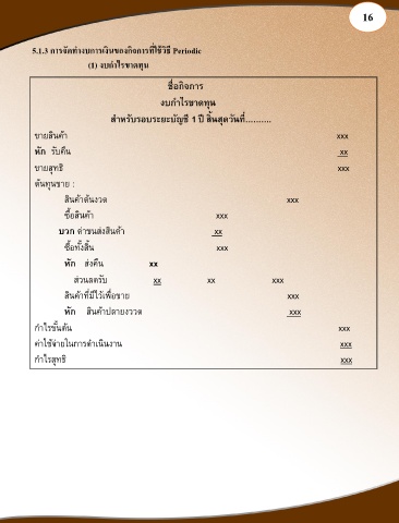16 5.1.3 การจัดท างบการเงินของกิจการที่ใช้วิธี Periodic (1) งบก าไรขาดทุน 1 ………. xxx xx xxx : xxx xxx xx xxx xx xx xx xxx xxx xxx xxx xxx xxx