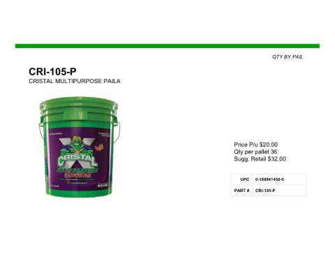 QTY BY PAIL CRI-105-P CRISTAL MULTIPURPOSE PAILA Price P/u $20.00 Qty per pallet 36 Sugg. Retail $32.00 UPC 0-188941450-0 PART # CRI-105-P
