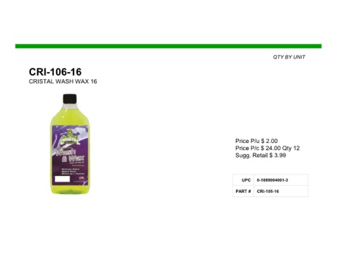 QTY BY UNIT CRI-106-16 CRISTAL WASH WAX 16 Price P/u $ 2.00 Price P/c $ 24.00 Qty 12 Sugg. Retail $ 3.99 UPC 0-1889004001-3 PART # CRI-105-16