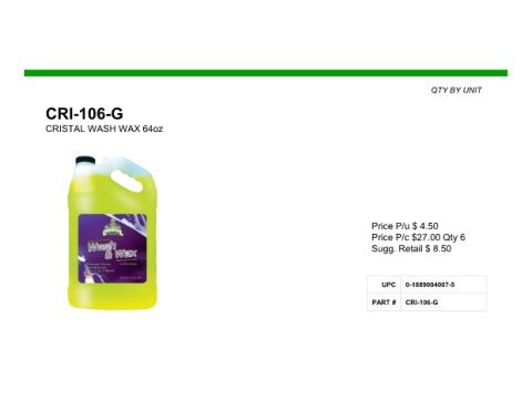 QTY BY UNIT CRI-106-G CRISTAL WASH WAX 64oz Price P/u $ 4.50 Price P/c $27.00 Qty 6 Sugg. Retail $ 8.50 UPC 0-1889004007-5 PART # CRI-106-G
