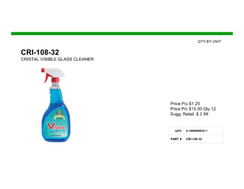 QTY BY UNIT CRI-108-32 CRISTAL VISIBLE GLASS CLEANER Price P/u $1.25 Price P/c $15.00 Qty 12 Sugg. Retail. $ 2.99 UPC 0-1889000032-1 PART # CRI-108-32