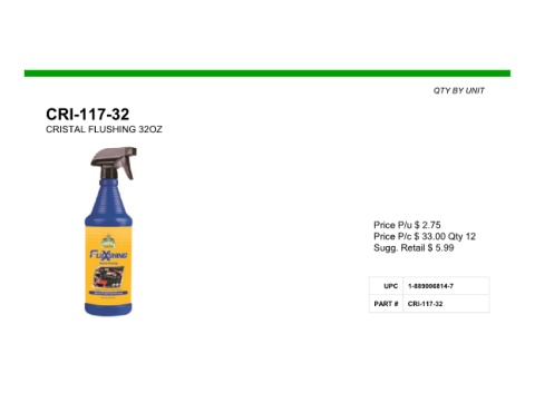 QTY BY UNIT CRI-117-32 CRISTAL FLUSHING 32OZ Price P/u $ 2.75 Price P/c $ 33.00 Qty 12 Sugg. Retail $ 5.99 UPC 1-889006814-7 PART # CRI-117-32