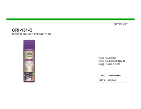 QTY BY UNIT CRI-131-C CRISTAL SACATO ENGINE 20 OZ Price P/u $ 2.60 Price P/c $ 31.20 Qty 12 Sugg. Retail $ 5.99 UPC 7-1889000844-9 PART # CRI-131-C