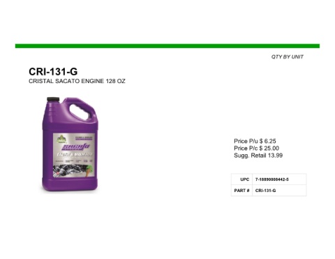 QTY BY UNIT CRI-131-G CRISTAL SACATO ENGINE 128 OZ Price P/u $ 6.25 Price P/c $ 25.00 Sugg. Retail 13.99 UPC 7-18890008442-5 PART # CRI-131-G