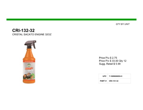 QTY BY UNIT CRI-132-32 CRISTAL SACATO ENGINE 32OZ Price P/u $ 2.75 Price P/c $ 33.00 Qty 12 Sugg. Retail $ 5.99 UPC 7-1889000854-5 PART # CRI-131-32